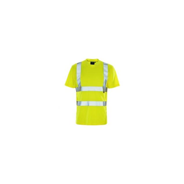 High-visibility yellow safety t-shirt with reflective silver strips across the chest and shoulders.